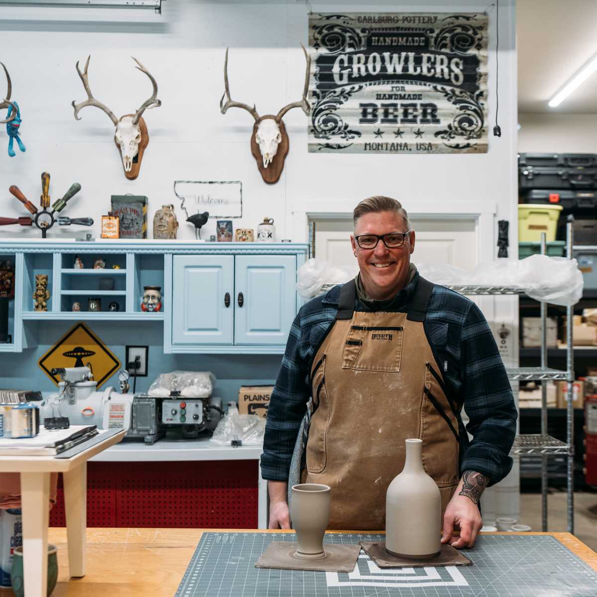 Tim Carlburg is a Made in Montana maker who lives, plays, creates and runs his business, Carlburg Pottery, in Columbia Falls, Montana. See Tim’s talent in action and shop unique ceramic creations at his website, handmadegrowlers.com.