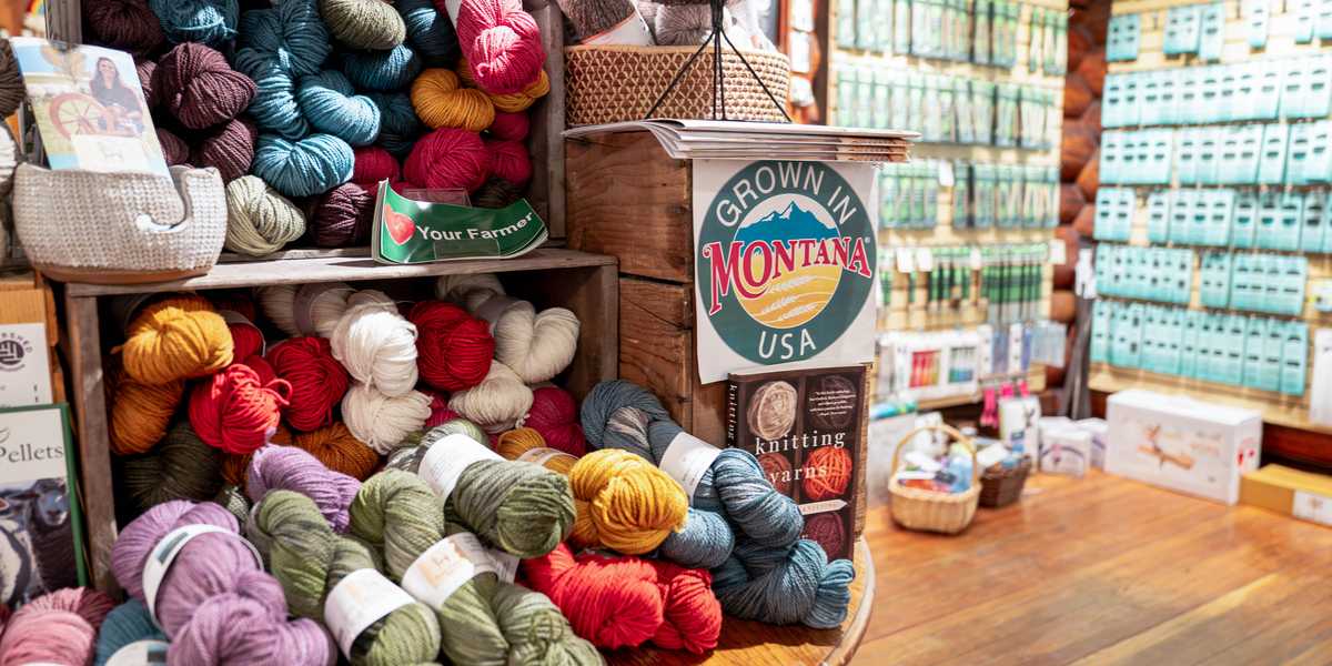 If you’re not sold on wool as the ultimate fiber with those two simple facts, Cindy Ruprecht will be happy to give you plenty more. From within the confines of Fiber, her cozy yarn shop in Bigfork, Cindy serves as an unofficial ambassador of the fiber arts in Montana — and she especially supports the use of local wool. “Everything on this table is grown in Montana, all local farms,” she says while waving her hands across an expanse of wool in her shop. Fiber is an official Grown in Montana retailer, “so we source stuff from all around the state,” she says.